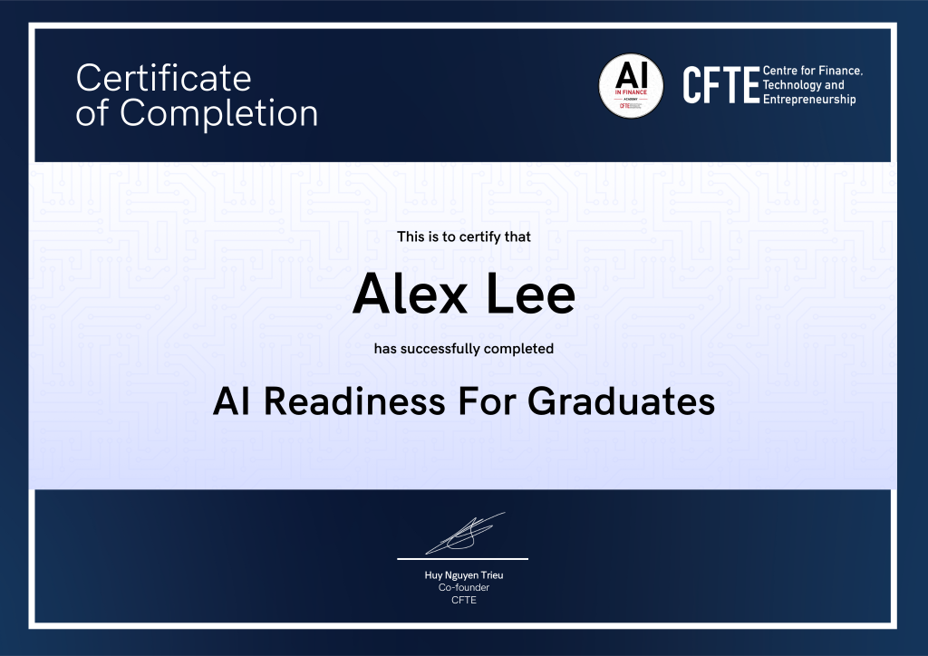 Receive a Certificate in AI Readiness For Graduates issued by CFTE. The certificate online can serve as a stepping stone to further advancement in your career. Don’t miss this opportunity to stand out in your field.